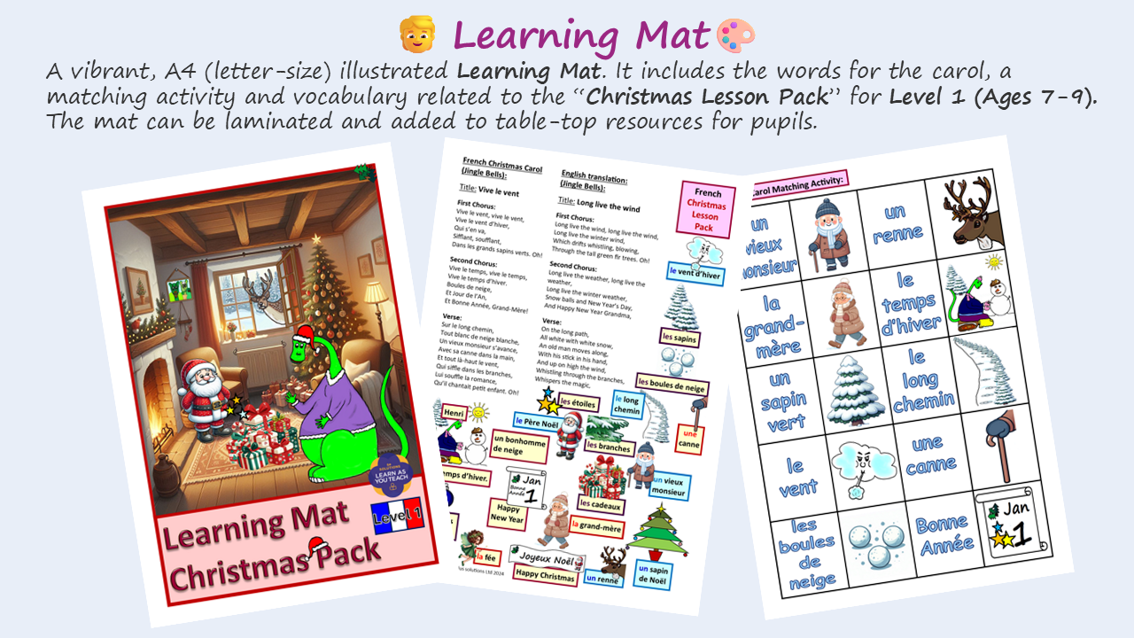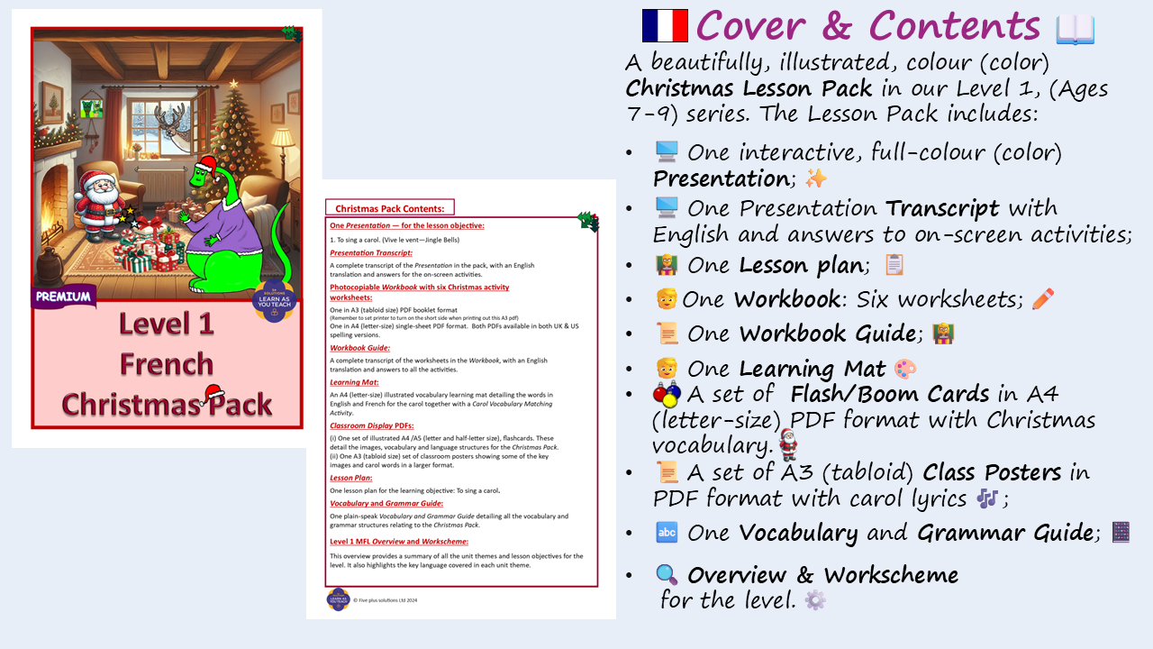 🎄 Make French festive and fun! Our Ages 7–9 French Christmas Pack gives you everything you need for an engaging Christmas lesson — an interactive Christmas‑themed presentation, listening activity, six‑page festive workbook, A3 posters, colourful flashcards, a vocabulary learning mat, plus full transcripts, guides, and a school site licence. 🎅✨