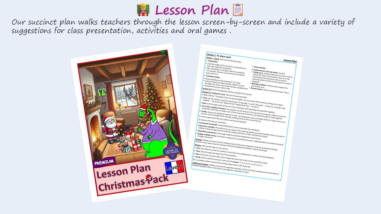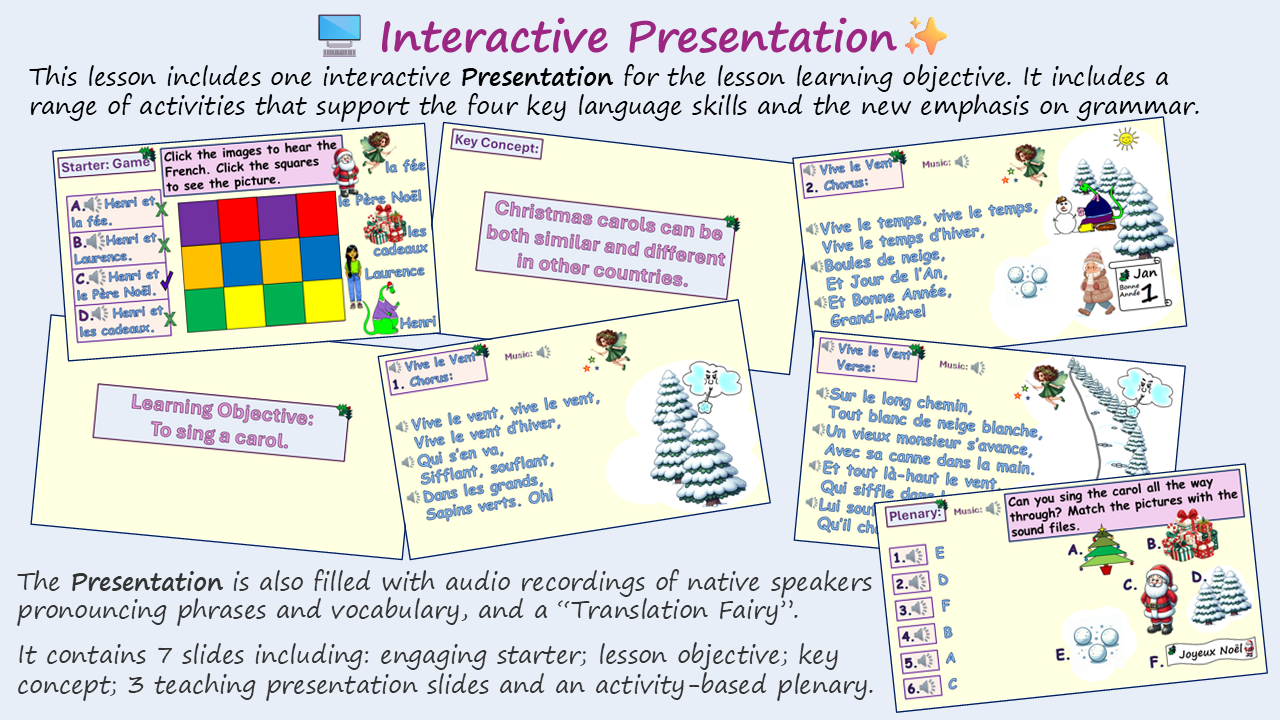 🎮 Interactive Lesson: A festive lesson with a Christmas game plus the words and music for Vive le vent (Jingle Bells).