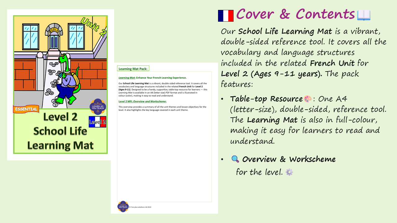 - Comprehensive Vocabulary: Dive into all the essential words and language structures from the related French Unit for Level 2 (Ages 9-11).