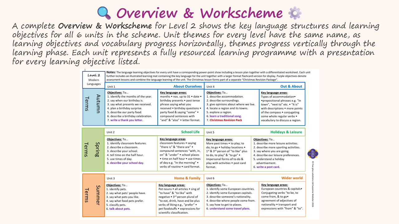 🎨 Enhance Your Learning Environment Explore our French Workbook, complete with worksheets and three fun activities per objective. Word banks support writing skills. And don’t miss our Workbook Guide, beautifully illustrated A4 Learning Mat and Class Display (flash/boom cards) – the finishing touches for an inspiring classroom.
