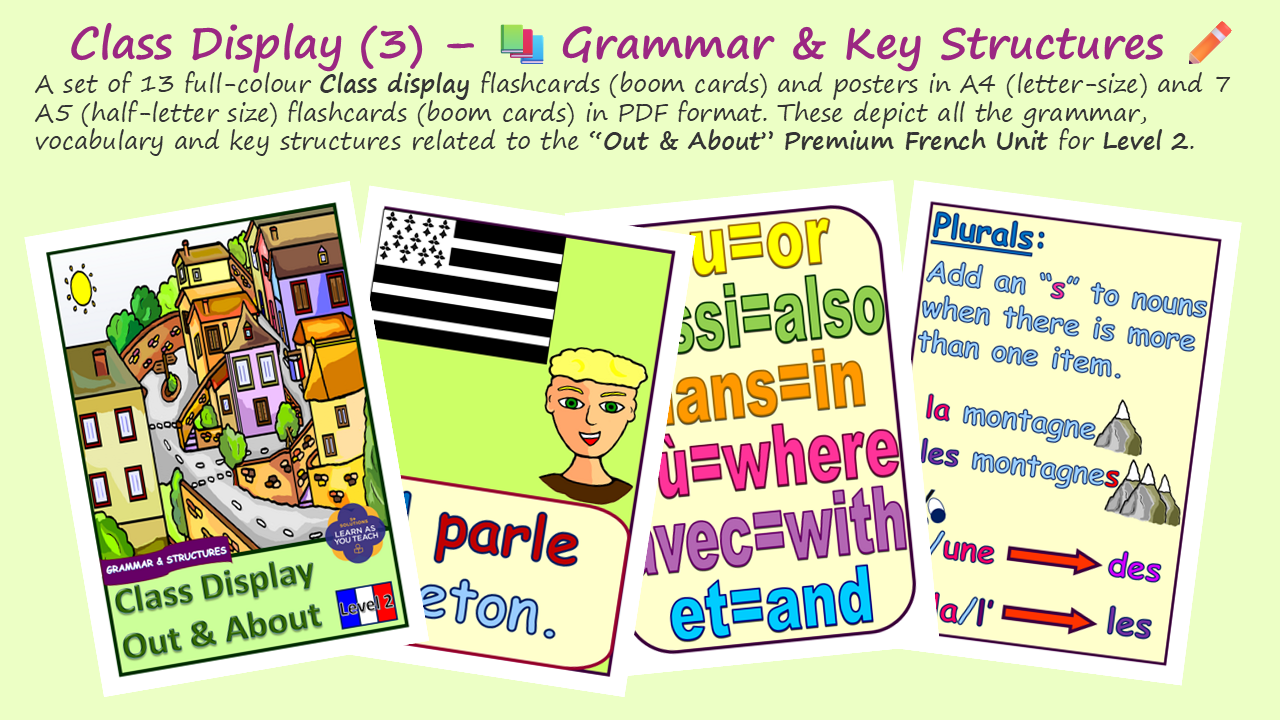 - Flash/Boom Cards 🎨: Three stunning PDFs in A4 (letter-size) of key vocabulary, structures, and grammar posters. Additionally, there are A5 (half-letter size) cards of key phrases.