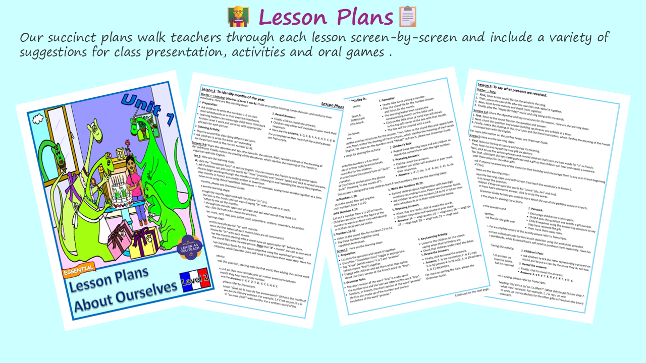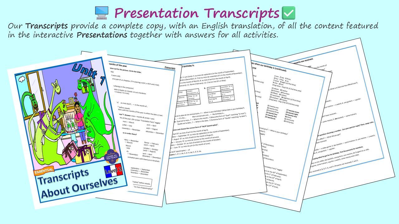 - 📜 Transcripts, Grammar Guide & Vocabulary – Complete teacher support.