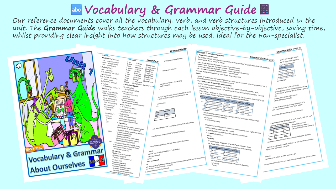 - ✏️ Ages 9-11: French Workbook – About Ourselves: Seven worksheets, Vocabulary, Grammar Guide & Workbook Guide.