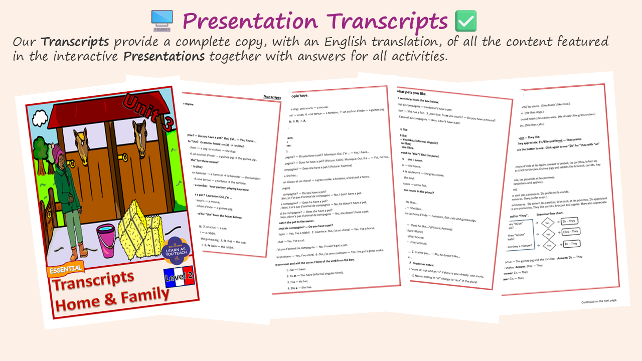 - 📜 Transcripts, Grammar Guide & Vocabulary – Complete teacher support.