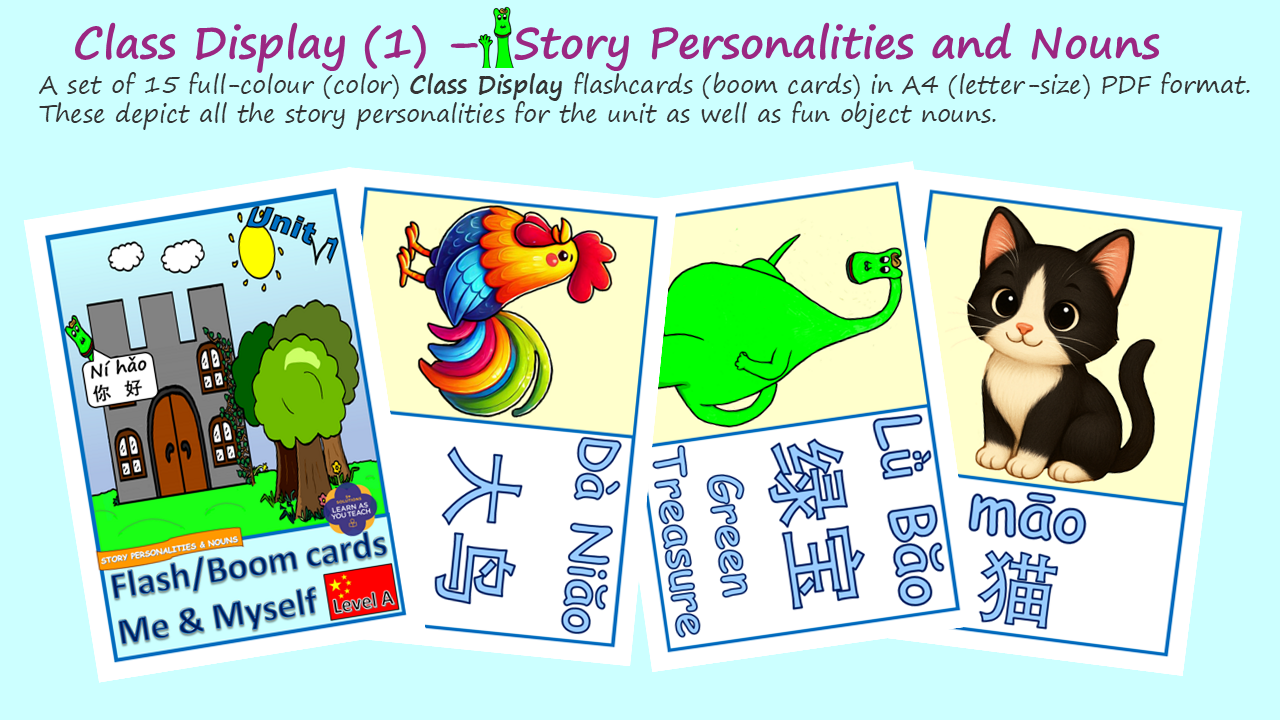 - 🐱 Story Personalities & Nouns: This PDF has 15 A4 (letter-size) flash/boom cards, showcasing all the story characters and nouns from the above unit. Perfect for creating a colourful (colorful) and educational display for young learners beginning their journey in Mandarin.